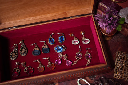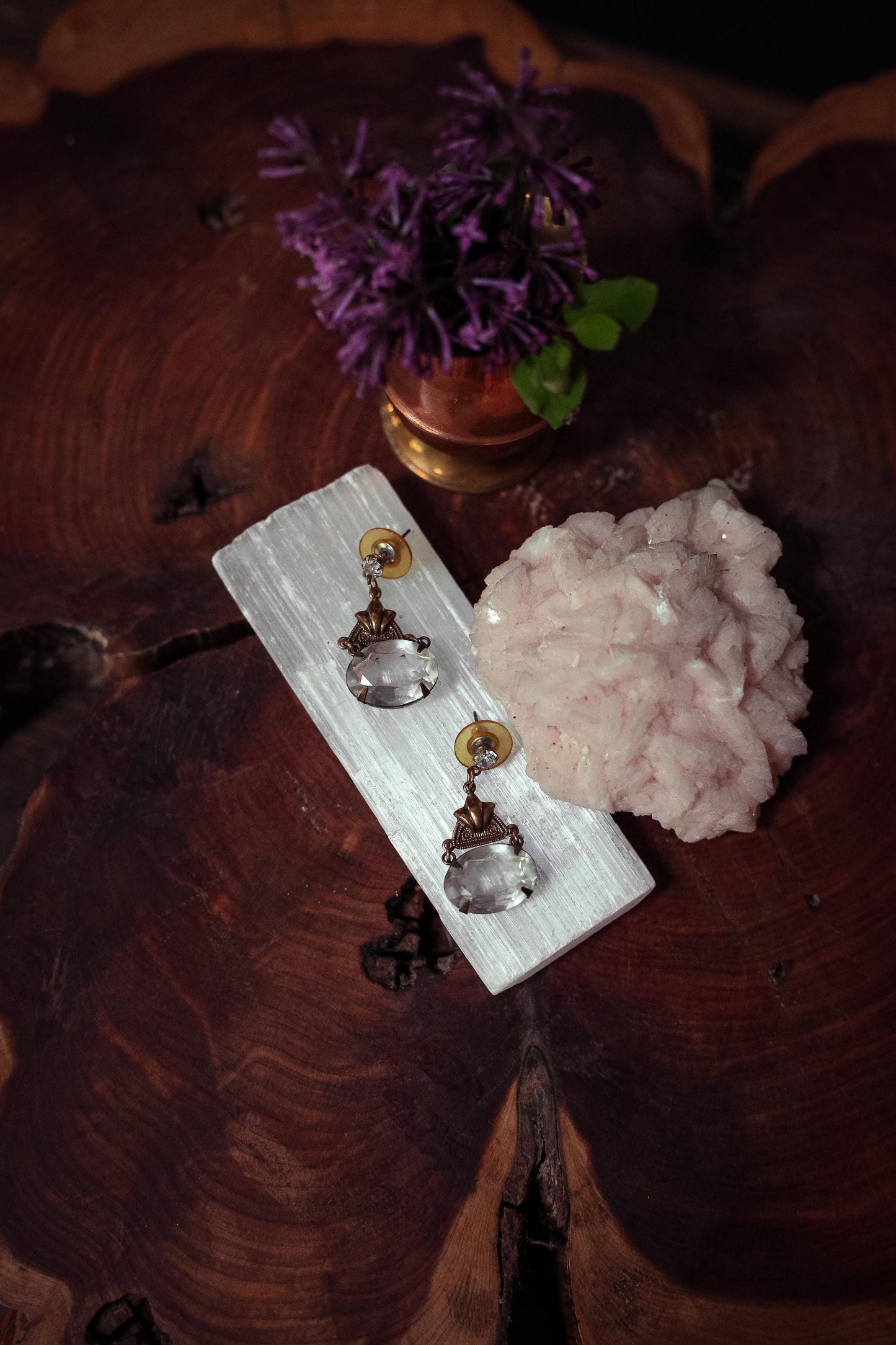 Beautiful pair of brass and clear crystal drop earrings. Post back features a smaller crystal with ornate brass drop and larger clear oval cut crystal at the bottom. The perfect way to add a little sparkle to an evening or everyday look.