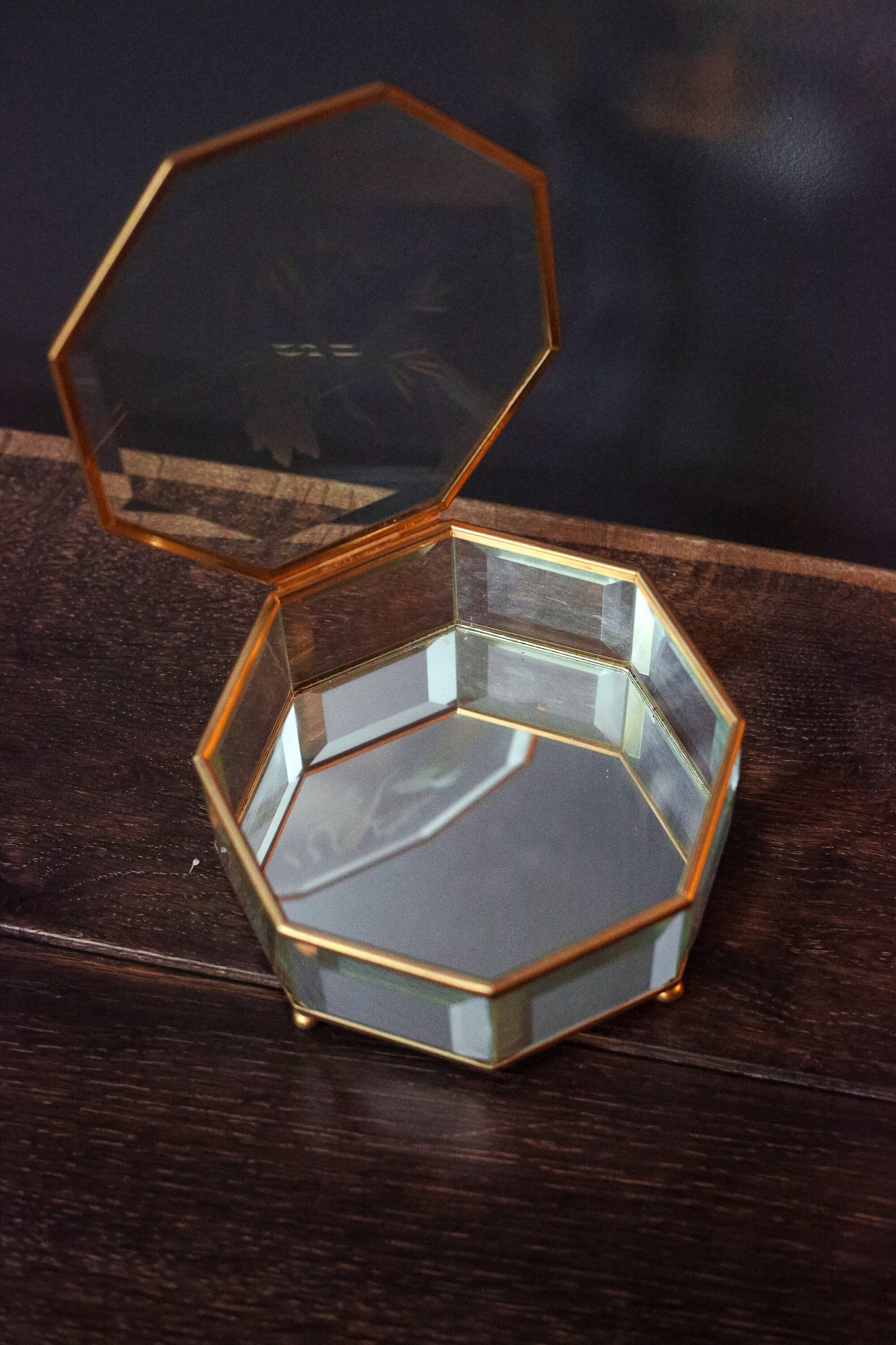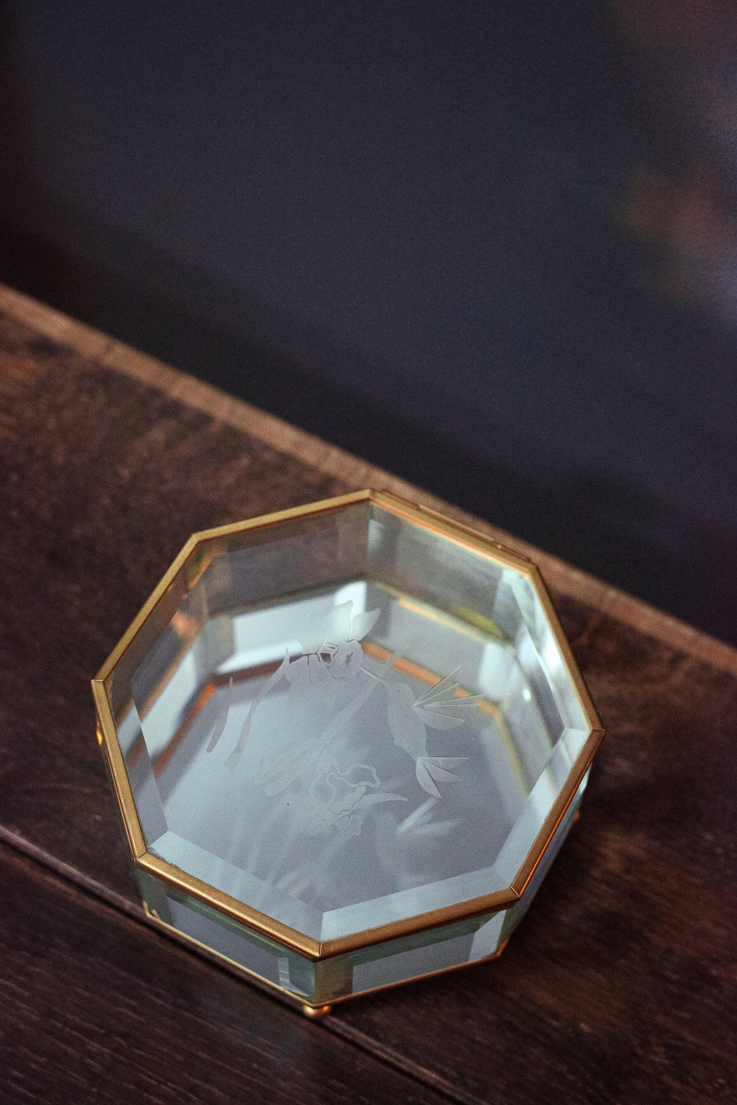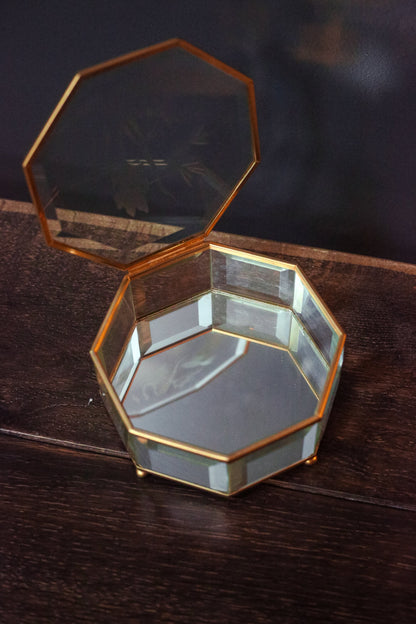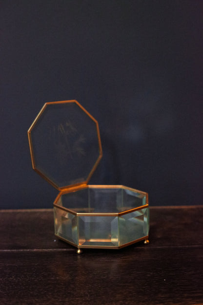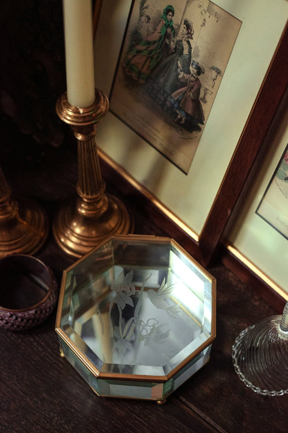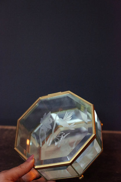 Etched Glass & Brass Octagon Mirrored Jewelry Box with Hummingbird Design - Octagonal Beveled Glass Jewelry Box with Mirror