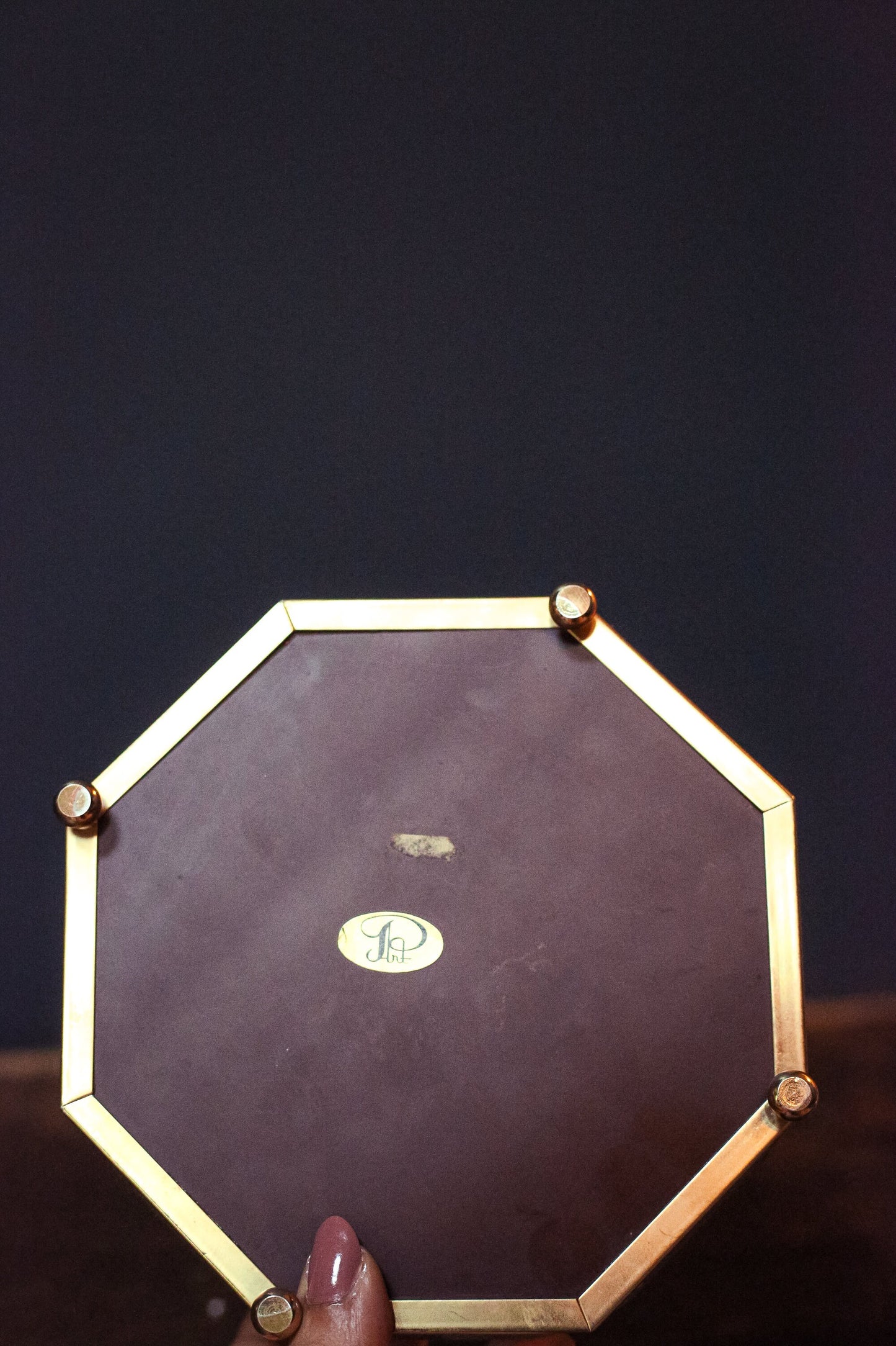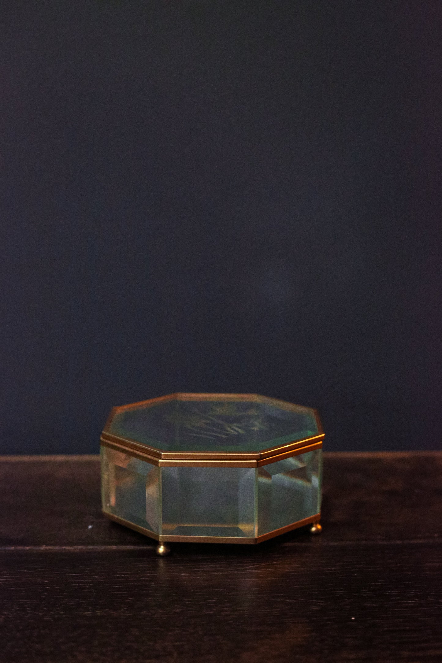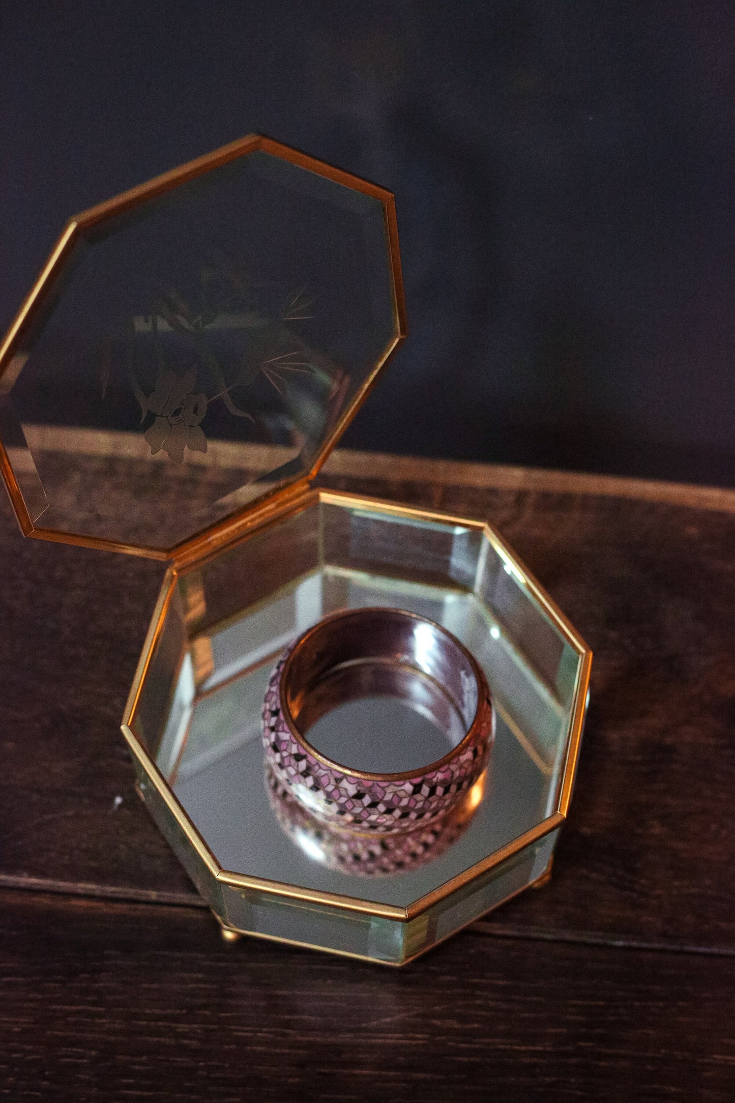 Brass and beveled glass octagon box with mirror and etched hummingbird floral design on top. Beautiful vintage condition and perfect addition to a vanity or nightstand.