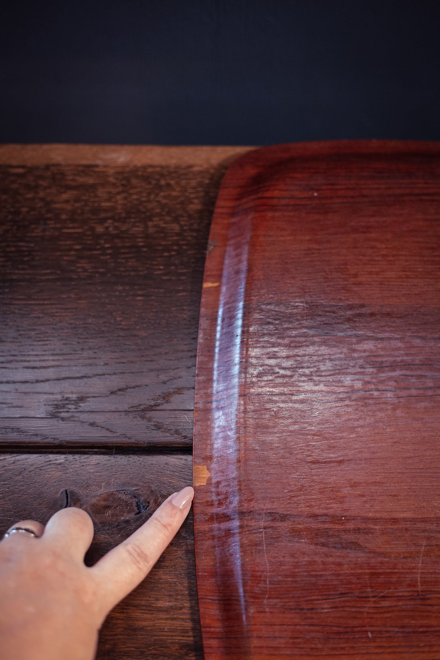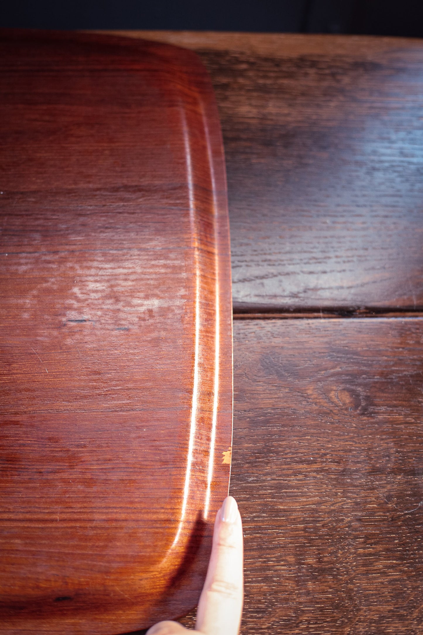 wear consistent with age & use - some chips to veneer on back, a small indentation on front/surface only visible at an angle