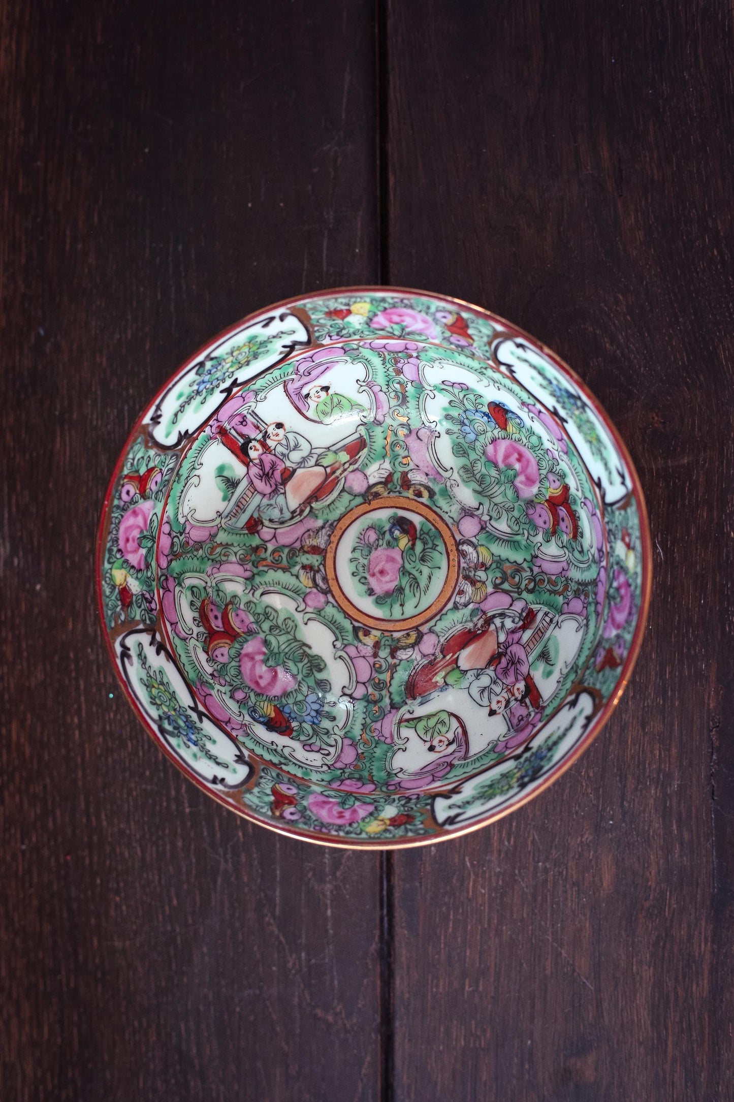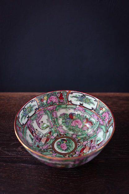 A hand painted Chinese Rose Medallion bowl with scenic and floral panels and gilt details.