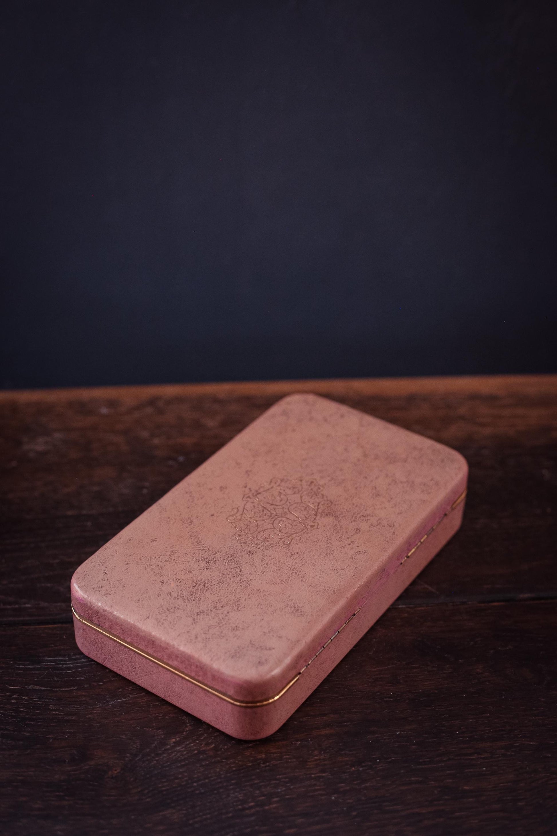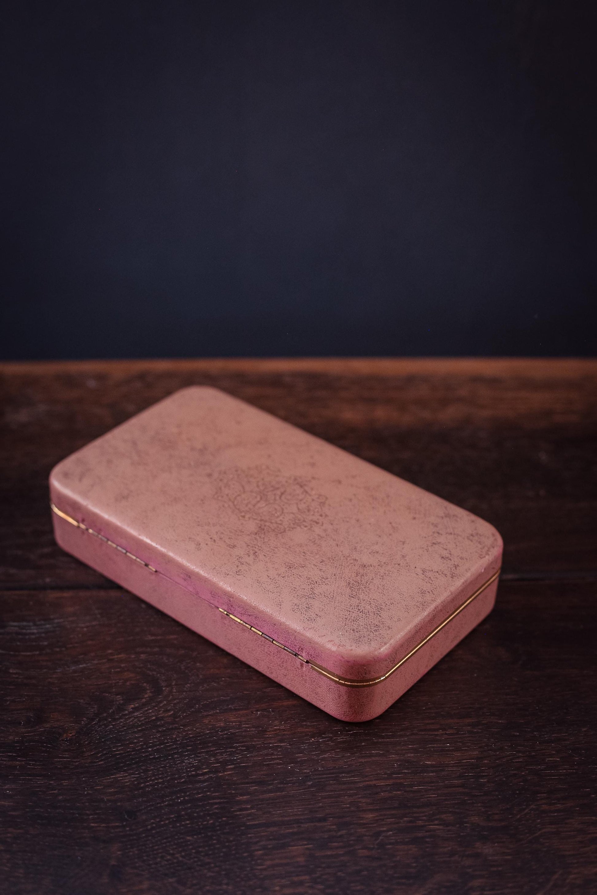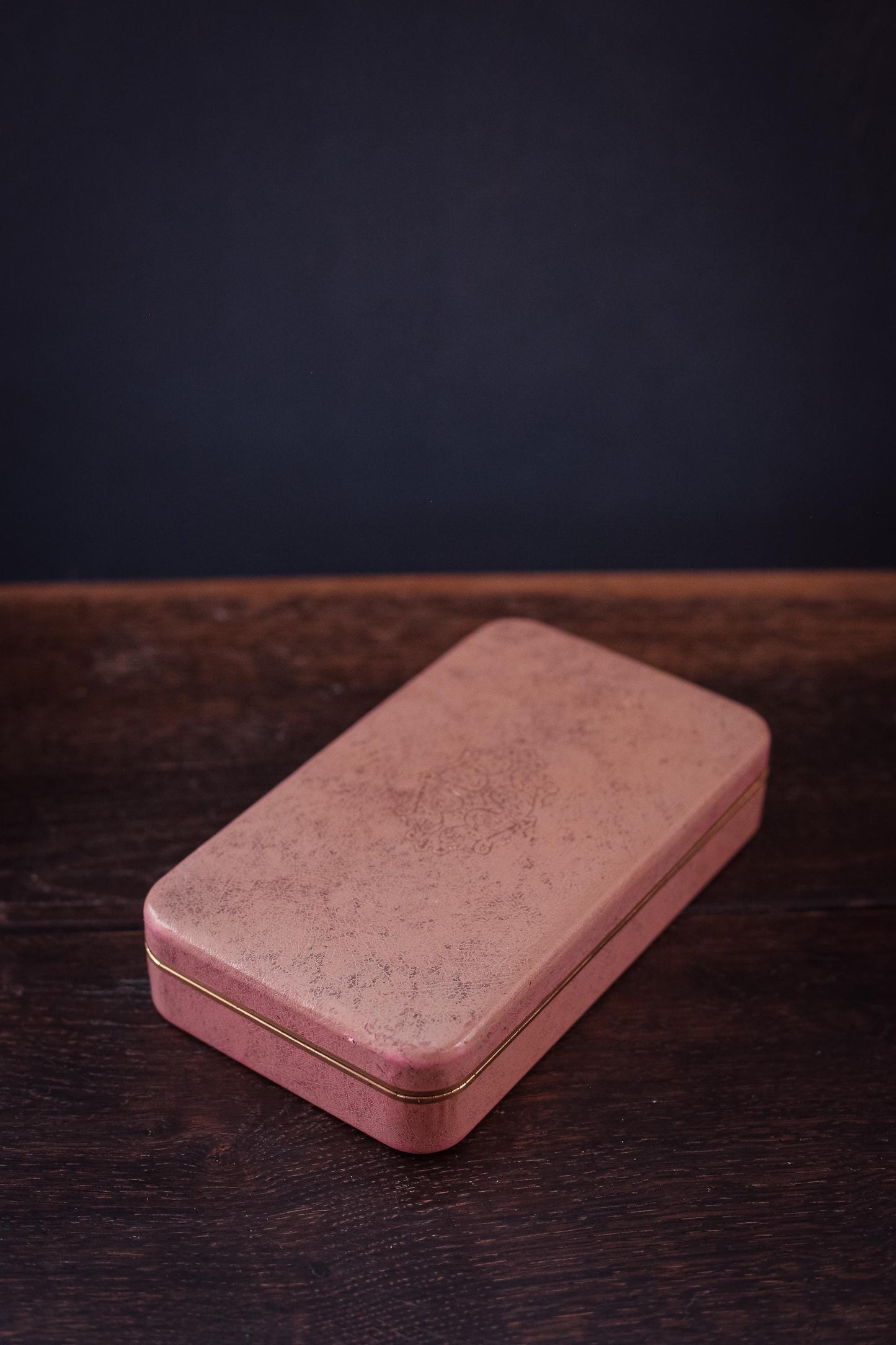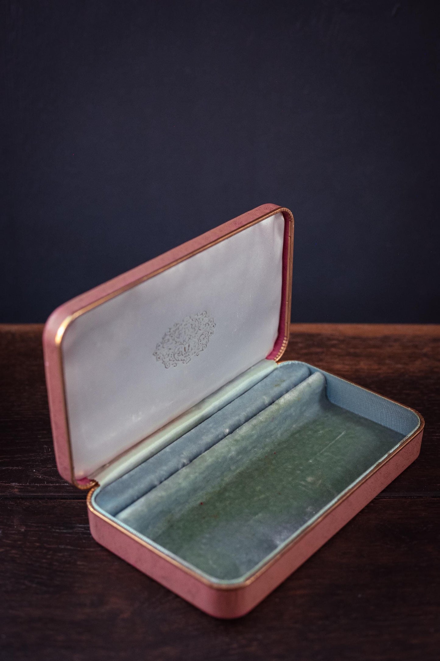 A petite Farrington jewelry case in pink texol exterior with gold embossed design and pale blue velvet and grosgrain interior. Interior of lid is white satin with gold embossed detail and bottom and top lips of box have a metal wrapping that is in good condition. Perfect small travel jewelry box for keeping tiny treasures accounted for in a larger bag.