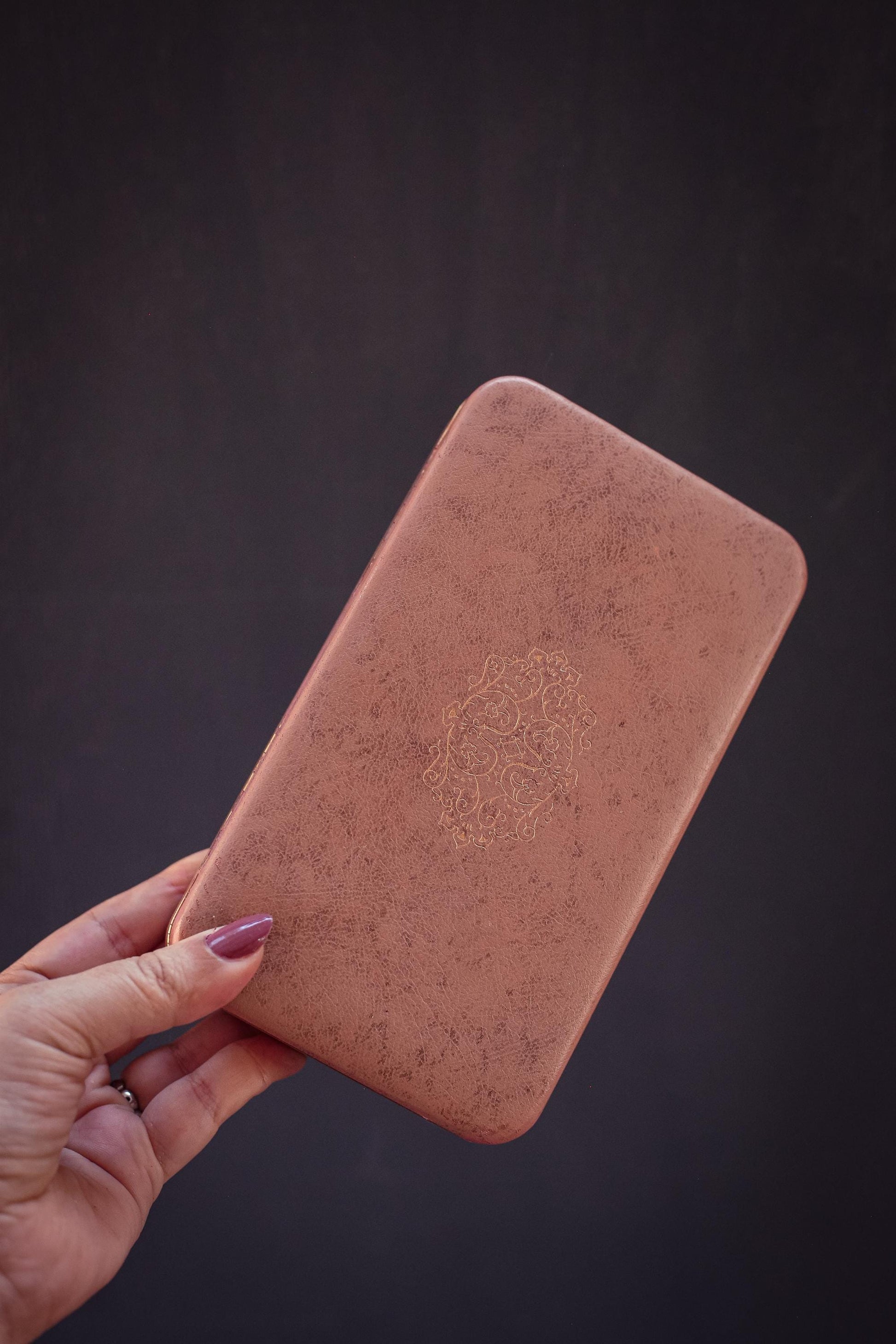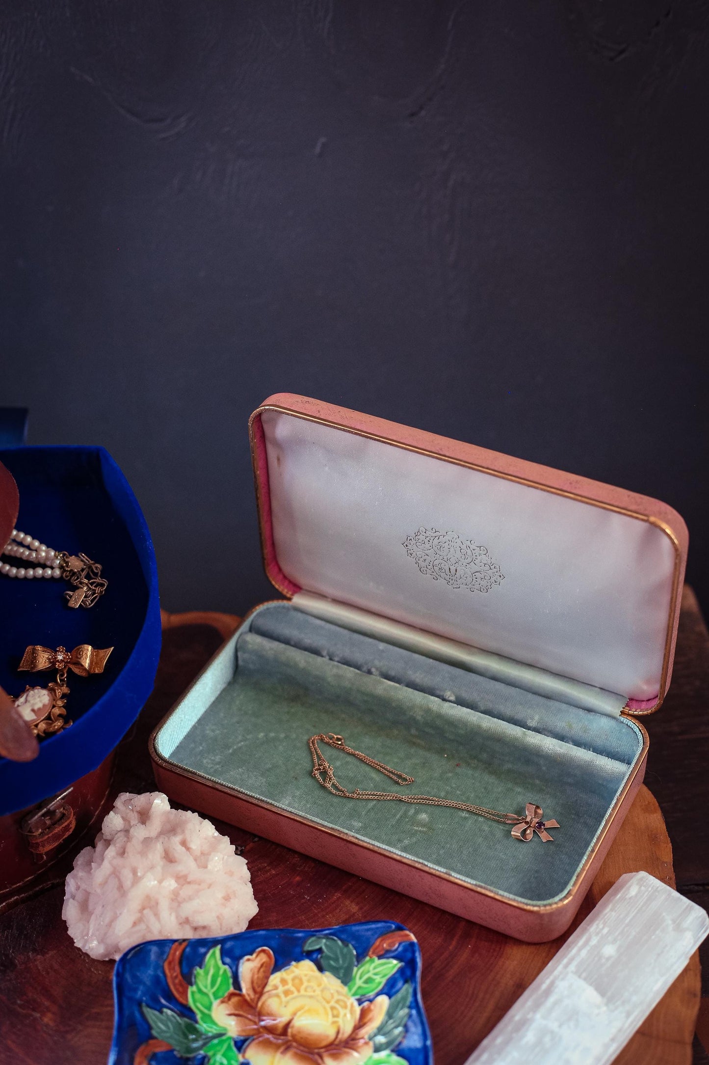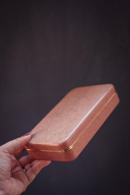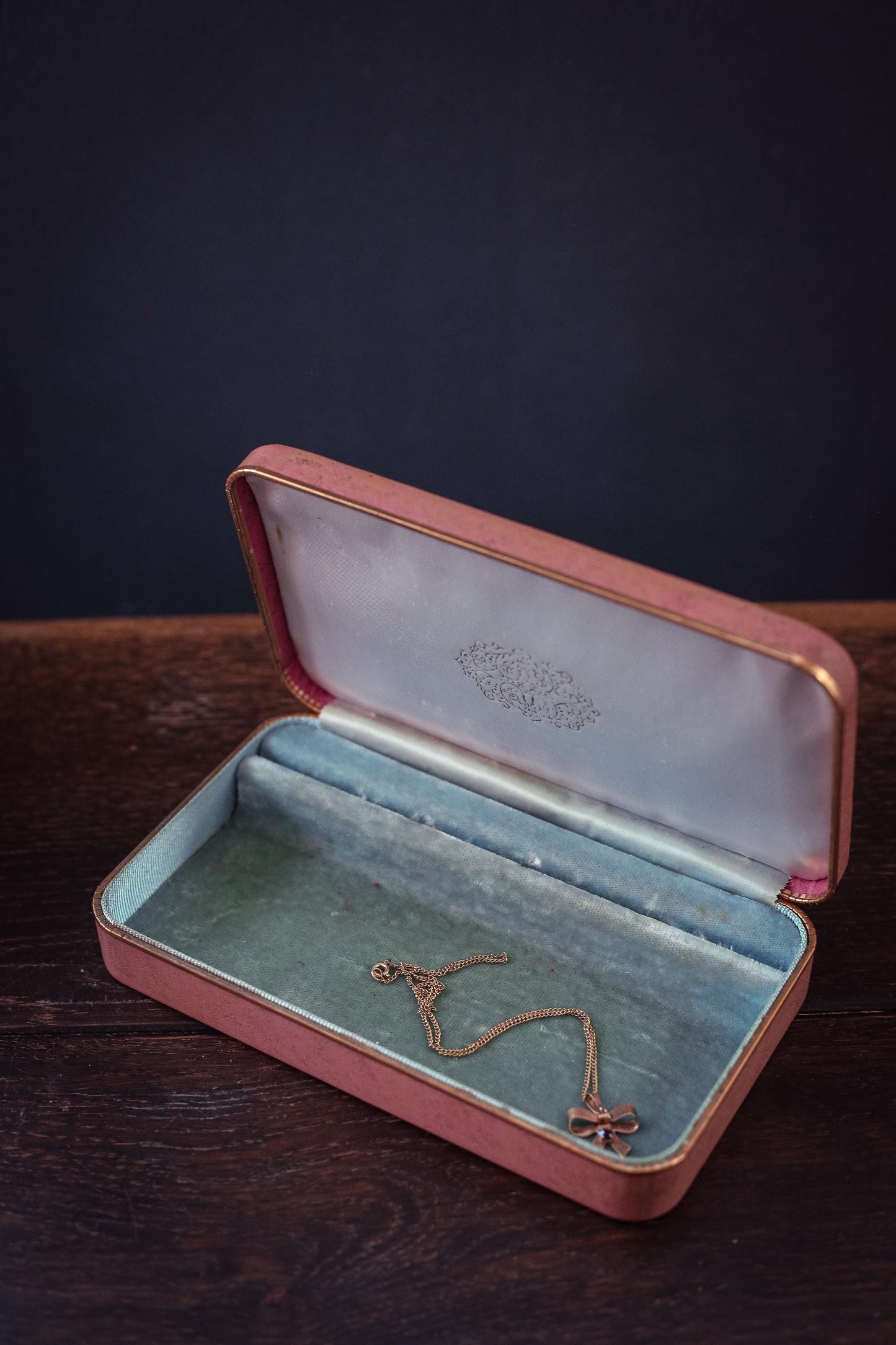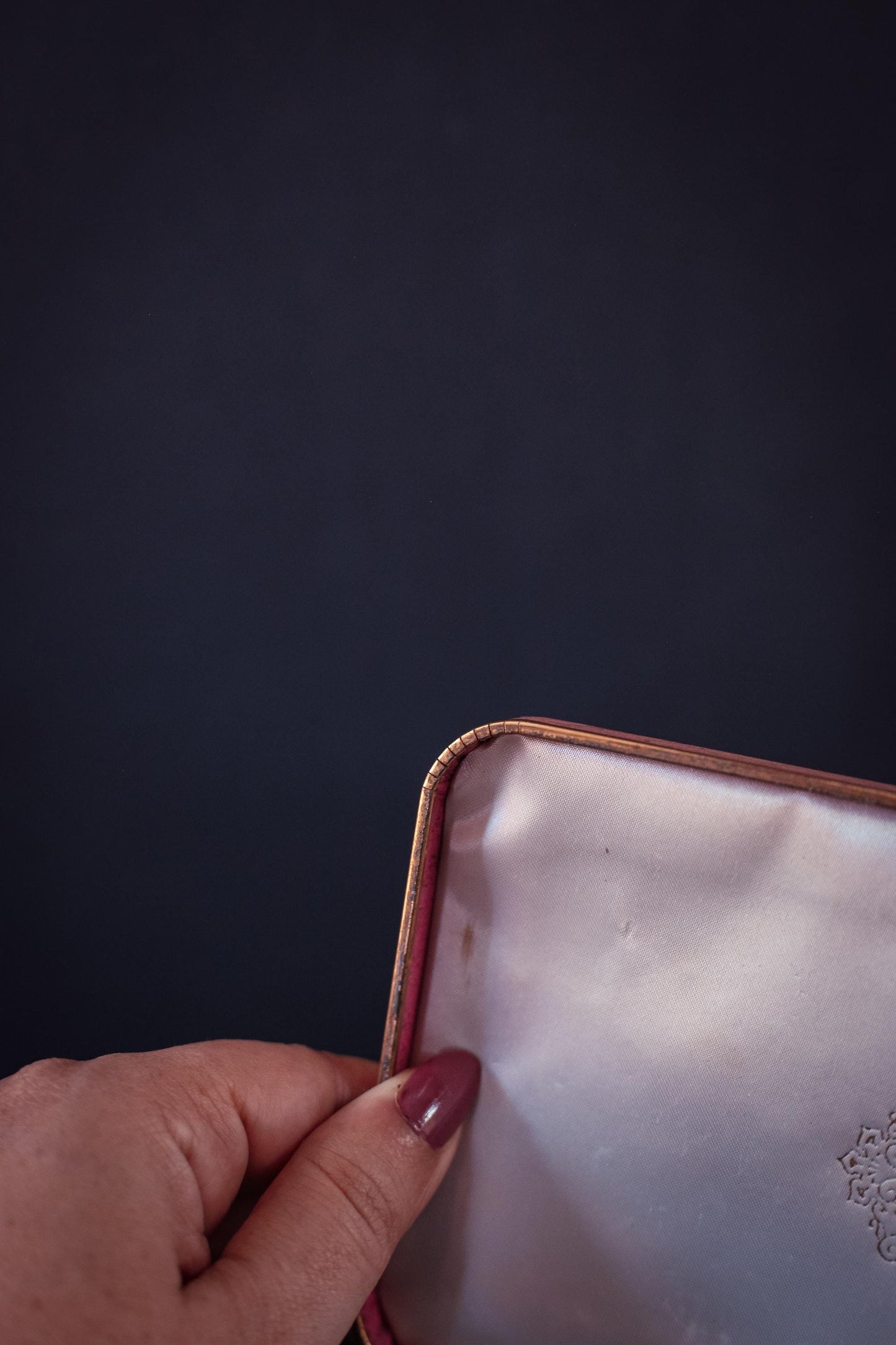 A petite Farrington jewelry case in pink texol exterior with gold embossed design and pale blue velvet and grosgrain interior. Interior of lid is white satin with gold embossed detail and bottom and top lips of box have a metal wrapping that is in good condition. Perfect small travel jewelry box for keeping tiny treasures accounted for in a larger bag.