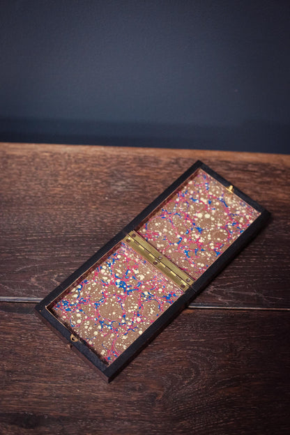 A vintage wooden hinged jewelery box with pressure release latch on front and brass medallion. Also features a colorful gilded art paper lining.