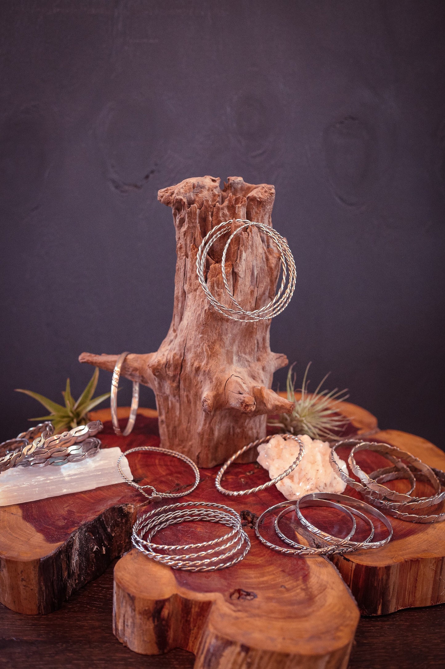 Mix and match Mexican sterling silver bangle bracelets, look beautiful stacked together or individually. Design features a twist/braid/spiral that is hammered flat.